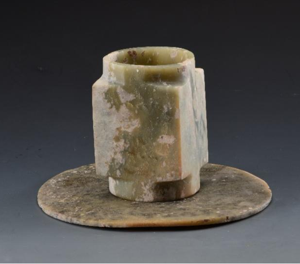 玉琮(編號總0128:1)高4~4.2厘米,外方邊長6.1~6.3厘米,內(nèi)徑5.2厘米,上端射較長,下端射極短,形制原始古樸,切割改制的現(xiàn)象明顯。