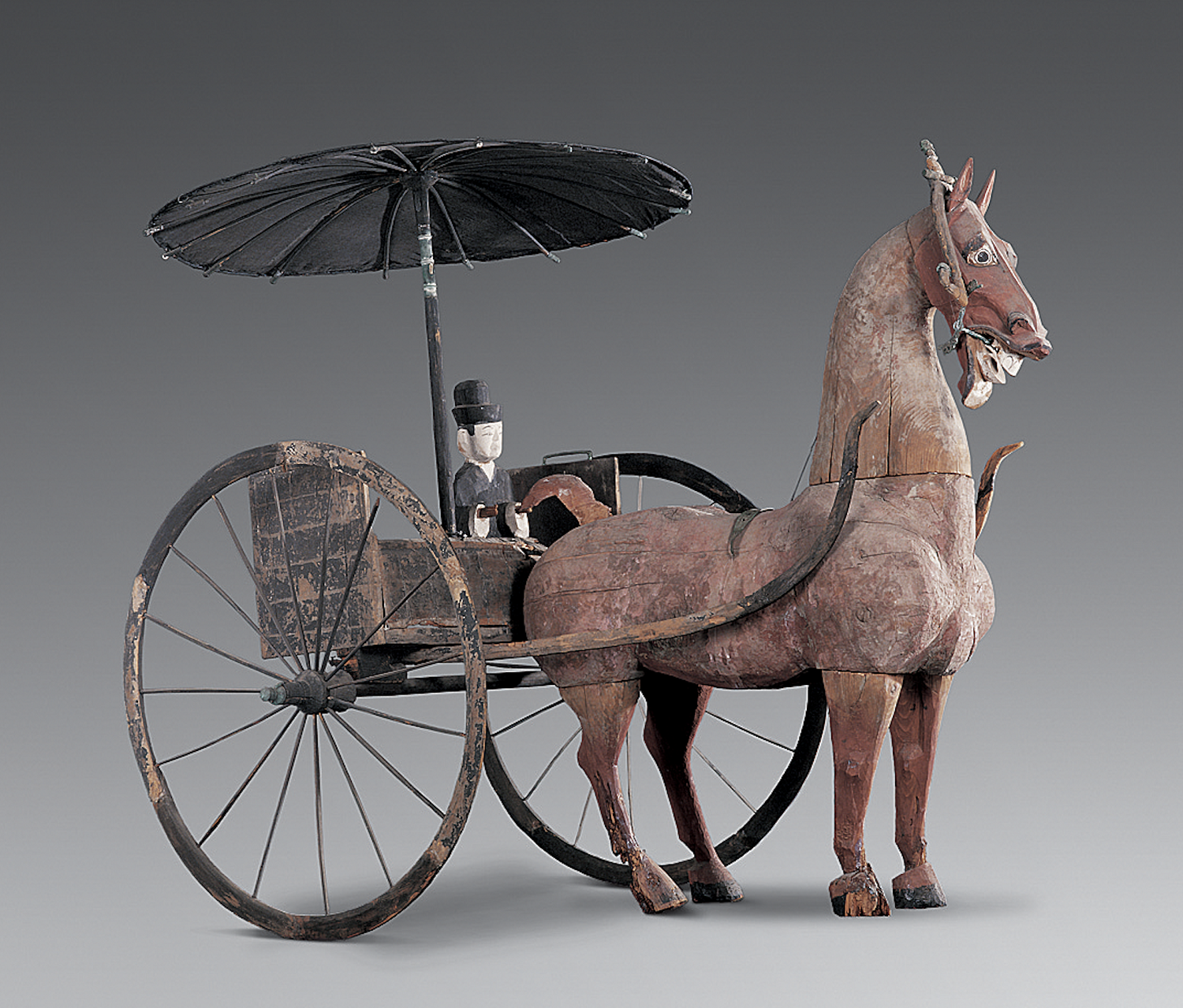 這輛彩繪木軺車的頂蓋為黑色絲織品