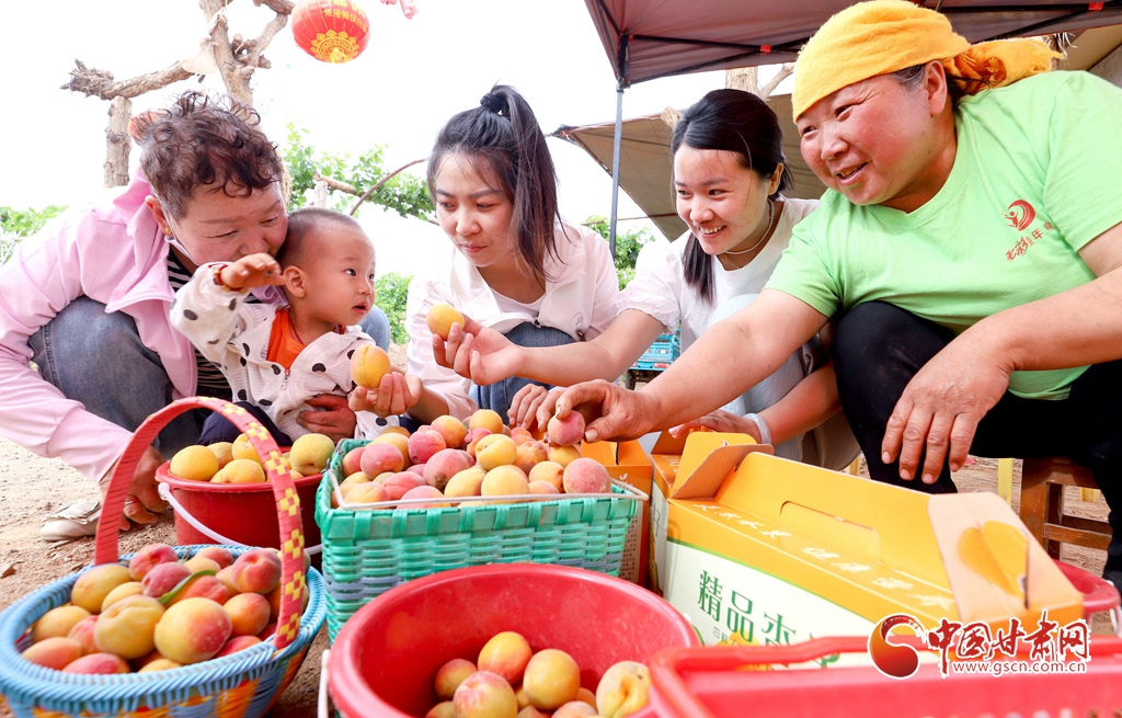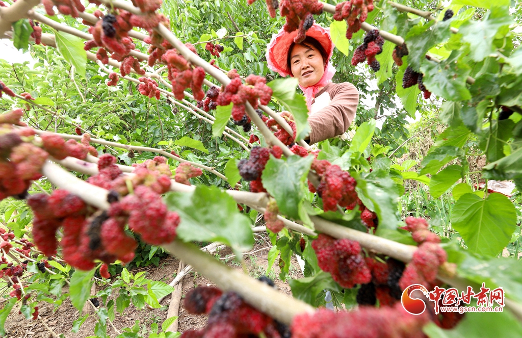 6月5日,在張掖市臨澤縣板橋鎮(zhèn),果農(nóng)們正在采摘成熟的杏子、桑葚、葡萄。