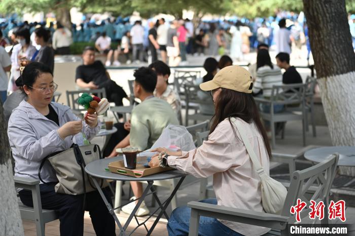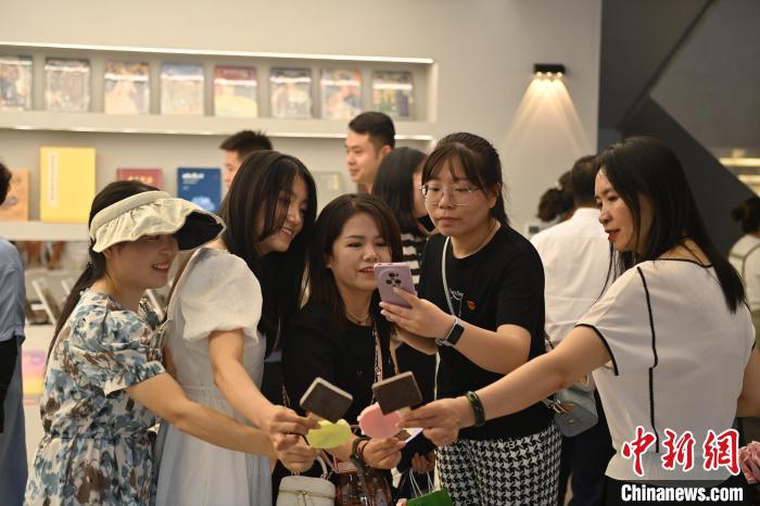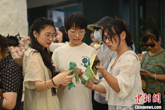 6月19日,甘肅省博物館藝術(shù)生活館在甘肅蘭州開館。該館是甘肅省博物館打造的一處復合型高價值文化空間,融合了咖啡、烘焙、展覽、藝術(shù)書店、文創(chuàng)銷售等多樣化業(yè)態(tài)。圖為游客相互交流挑選的綠馬玩偶掛件。中新社記者 李亞龍 攝