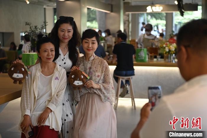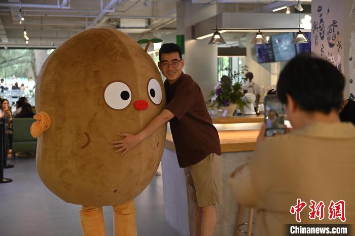 6月19日,甘肅省博物館藝術(shù)生活館在甘肅蘭州開館。該館是甘肅省博物館打造的一處復合型高價值文化空間,融合了咖啡、烘焙、展覽、藝術(shù)書店、文創(chuàng)銷售等多樣化業(yè)態(tài)。圖為顧客與蘭州凍梨文創(chuàng)真人玩偶合影。中新社記者 李亞龍 攝