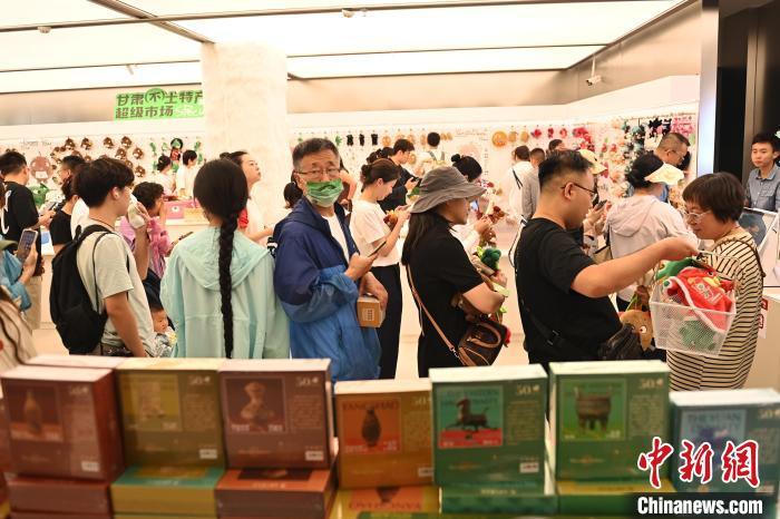 6月19日,甘肅省博物館藝術(shù)生活館在甘肅蘭州開館。該館是甘肅省博物館打造的一處復合型高價值文化空間,融合了咖啡、烘焙、展覽、藝術(shù)書店、文創(chuàng)銷售等多樣化業(yè)態(tài)。圖為顧客排隊買單。中新社記者 李亞龍 攝