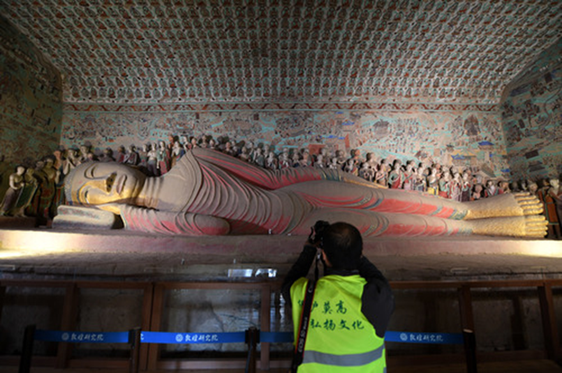 2016年10月11日,百名攝影師分組分批走進甘肅敦煌莫高窟洞窟內部進行攝影創(chuàng)作,領略莫高窟神韻。圖為當日,攝影師在敦煌莫高窟第148窟拍攝臥佛。新華社記者范培珅攝
