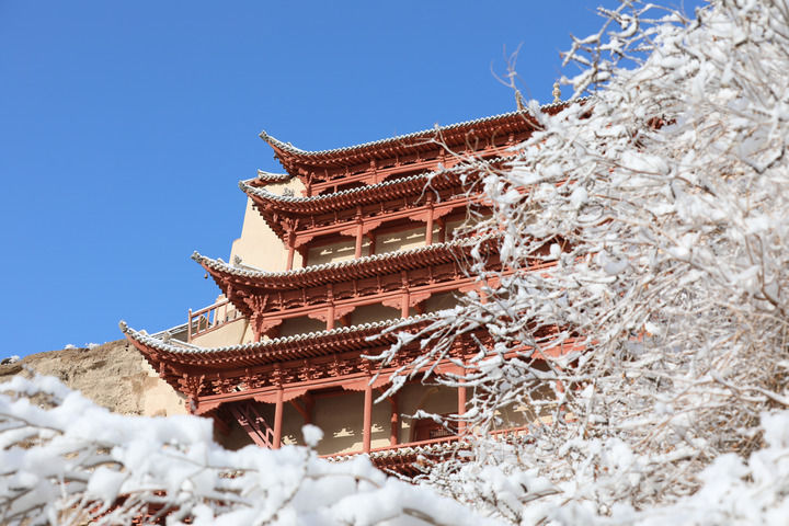 2022年3月24日至25日,甘肅省敦煌市迎來一場春雪。雪后的世界文化遺產敦煌莫高窟銀裝素裹,景色如畫。圖為3月25日拍攝的雪后的敦煌莫高窟景區(qū)九層樓。新華社記者李俞輝攝