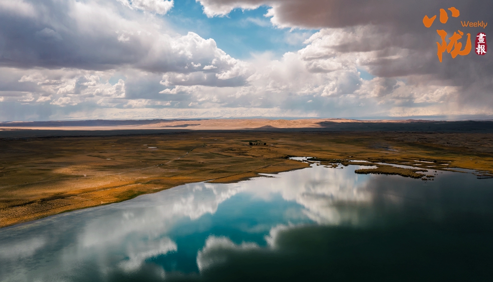 放眼望去,高低不平的草灘上嵌著一洼巨大的清亮的湖水,水面平靜,水清見(jiàn)底,像明鏡一樣的湖水映出了藍(lán)天白云的倒影。