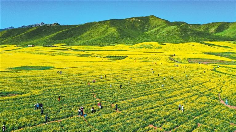 一路前行,一路風(fēng)景。一片片的油菜花開得生機(jī)勃勃,連天接地,引得游人駐足拍照。萬畝油菜花海隨風(fēng)起伏,如同時(shí)間長(zhǎng)河里濺起的金色浪花,游人穿行于花海中,臉上都露出了孩子般的笑容,愜意而放松……