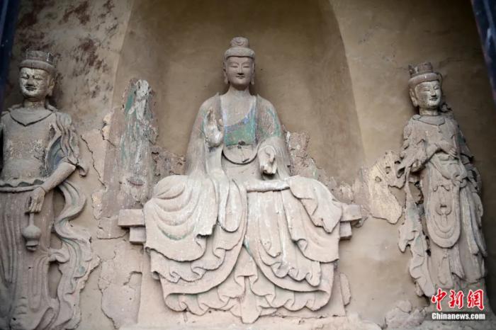 麥積山石窟第44窟的西魏泥塑一佛二菩薩組像。主尊佛像被譽為“東方美人”。九美旦增 攝