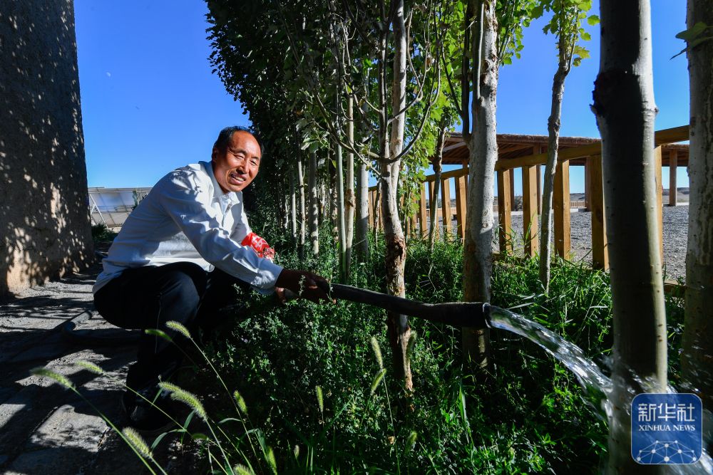 ↑7月16日,張吉全為親手栽植的白楊樹澆水。