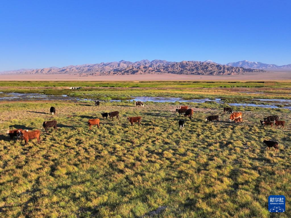 盛夏時(shí)節(jié),地處甘肅省酒泉市阿克塞哈薩克族自治縣阿伊納鄉(xiāng)境內(nèi)的大、小蘇干湖濕地,綠草如茵,牛羊成群,呈現(xiàn)出一幅生機(jī)勃勃的草原生態(tài)畫卷。