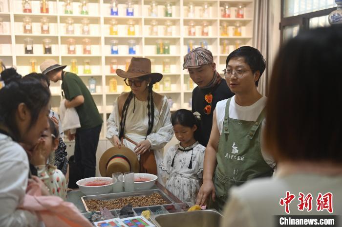 8月20日,甘肅敦煌莫高里工匠村內,研學導師向學員介紹敦煌礦物質顏料。工匠村開設了泥板畫、彩繪、雕塑制作、剪紙、農耕體驗等課程,現(xiàn)已發(fā)展成為一個集敦煌文化講堂、壁畫書法研習、美術設計、彩塑制作教學、篆刻藝術、傳統(tǒng)釀酒體驗、農業(yè)產業(yè)發(fā)展等于一體的多功能實訓基地。中新社記者 李亞龍 攝