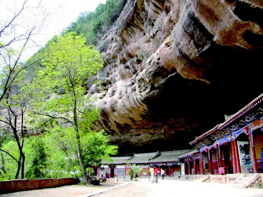 那天,自然之神行走于隴山渭水間,他雙手揮動(dòng),如雕如塑,將山川大地刻畫得瑰麗而神奇。當(dāng)他完成麥積山的杰作后,輕輕一拂指尖,卻不小心將一座砂崖的底部抹去,使之形成一面巨大的石檐。這石檐下,形狀恰似蛤蟆之嘴,能藏千軍萬馬,充滿了神秘與威嚴(yán)。