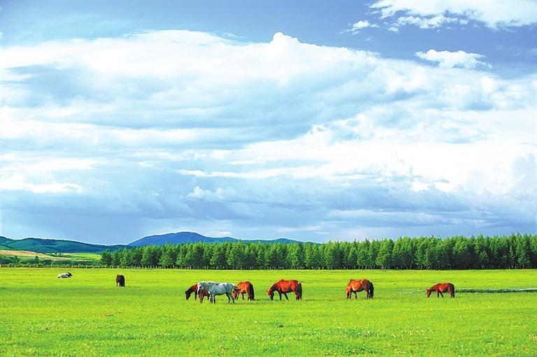 置身草原,高遠(yuǎn)空曠的天空下面,是明凈遼闊的草場(chǎng),白色的羊和黑色的牛像灑落在草叢中的白珍珠和黑珍珠,一頂頂帳篷點(diǎn)綴其間,不遠(yuǎn)處,有游人騎在馬背上,優(yōu)哉游哉,或拍照或奔馳。這里一年四季景色都十分迷人:春天山花爛漫,姹紫嫣紅,如煙如夢(mèng);夏季綠草如茵,碧波浪涌,養(yǎng)心養(yǎng)眼;秋天云纏霧繞,層林盡染,美麗迷人;冬天銀裝素裹,瓊花玉樹,一派北國(guó)風(fēng)光。