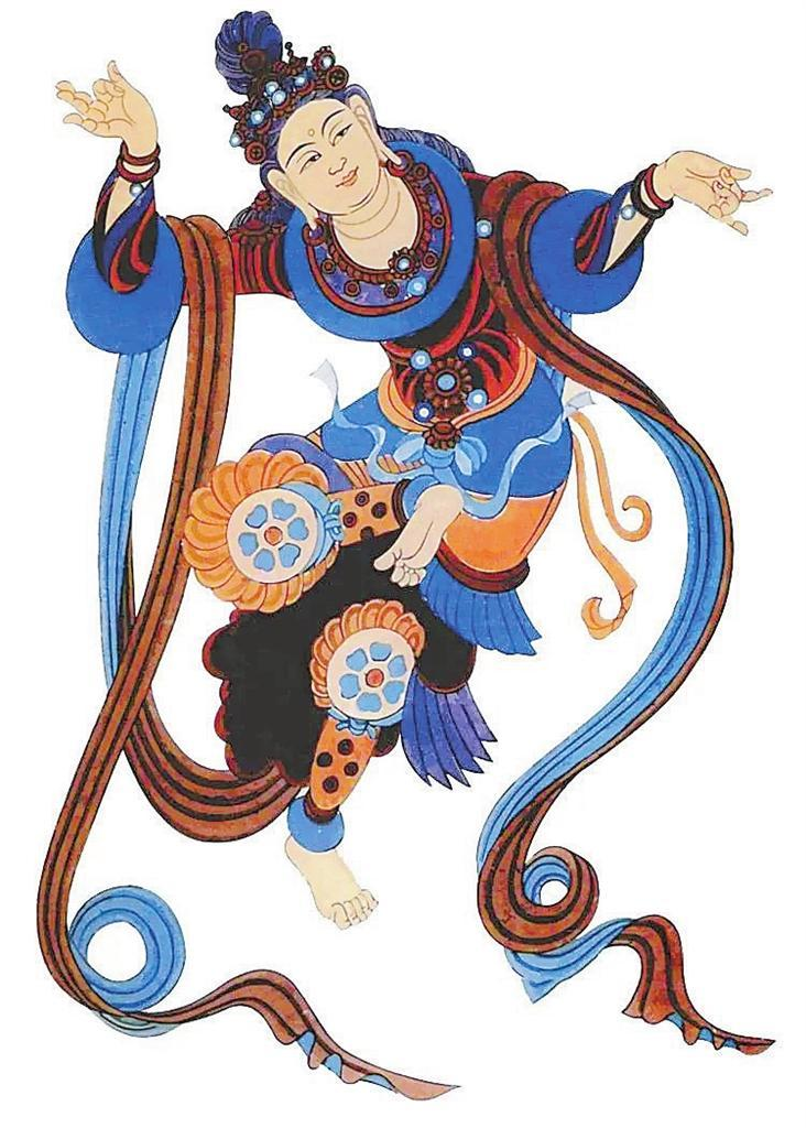 敦煌莫高窟,窟窟有壁畫,拼接起來長(zhǎng)達(dá)45000多平方米,有世界上“最大畫廊”之稱。這些壁畫中,幾乎每幅都有舞蹈形象,如在窟頂、龕楣、藻井遨游的飛天,憑欄上的天宮伎樂,經(jīng)變畫中的娛佛、敬佛的獻(xiàn)舞者——伎樂天,出行圖中跳著具有濃郁生活氣息的世俗樂舞,以及富有舞蹈美感的彩塑菩薩、天王力士等,琳瑯滿目,精妙絕倫。這些舞蹈形象充分反映了從十六國(guó)北朝至元代千余年來不同歷史時(shí)期的舞蹈服飾、形態(tài)、風(fēng)貌,為我們挖掘、整理、弘揚(yáng)中華民族舞蹈文化提供了十分珍貴的形象資料。