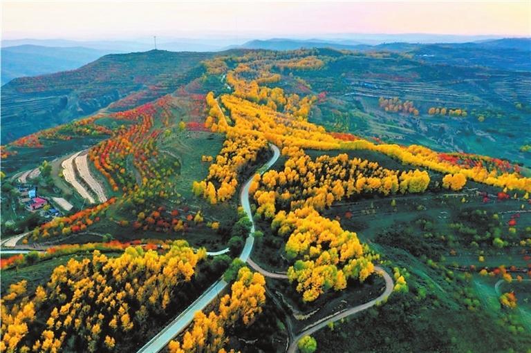 金秋時(shí)節(jié),這里秋葉五彩繽紛,黃得如金,綠得如玉,紅得如火,把秋姑娘打扮得格外妖嬈。一陣涼風(fēng)拂過(guò),金黃的樹(shù)葉,搖曳著一把把小扇子,從空中飄飄而下,似乎在訴說(shuō)著一個(gè)美麗的童話。村落散落在綿延數(shù)里的山腳下,村前屋后金色圍繞,梯田如鏈似帶、穿插交錯(cuò),如一幅幅線條簡(jiǎn)潔明快的木刻版畫(huà)。