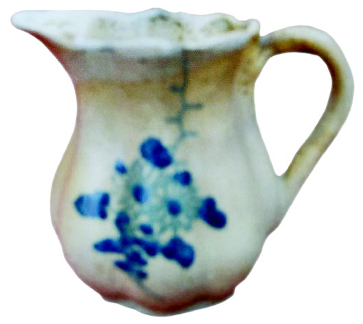 該口杯高10cm,上口手捏黏泥接連,珍珠釉澆注粘連處留有數(shù)滴珍珠釉淚珠??谘厍皟A,連口粘痕明顯裸露。通體呈吊南瓜分棱,八道指泥壕顯八股棱條。造型珍瓏靈秀,珍貴之處在于上施淺瑪瑙釉,體面使用藍(lán)寶石礦料畫一束盛開的菊花。畫筆嫻熟簡練,富有立體感,且活靈活現(xiàn)。在背面腰中部,用淡青花題“□□”二字,字雖模糊不清,但胎土細(xì)膩,瓷壁輕薄又堅(jiān)硬如骨,胎底色黃中泛紅,瓷體表面青釉中又泛小針褐色點(diǎn)。把手處,窯變?yōu)轵球咀吣嗉y。這種泥紋,沉重古樸,明亮而深沉,是釉層在干燥或燒成時(shí)發(fā)生干裂,后在高溫階段又有釉流入填補(bǔ)而形成的。在民國以前,蚯蚓紋曾被作為判斷鈞釉的唯一標(biāo)準(zhǔn)。