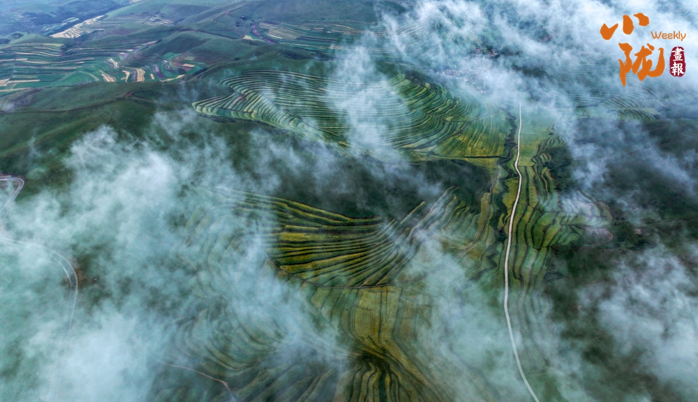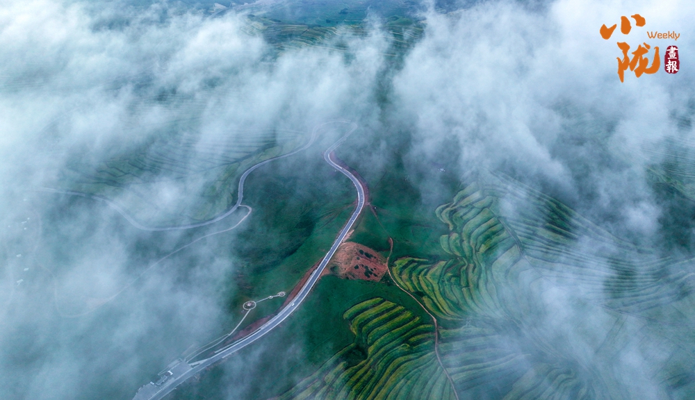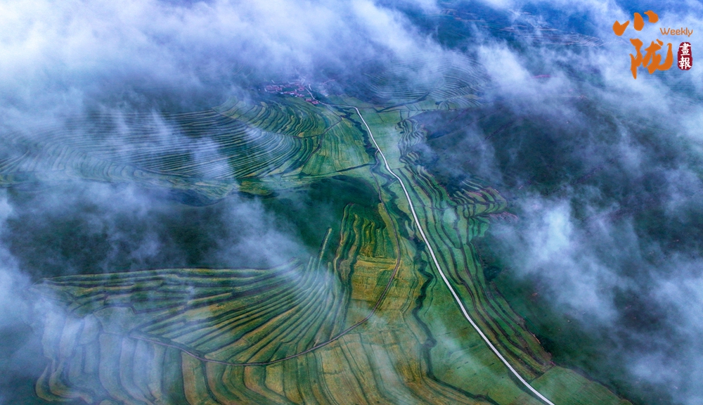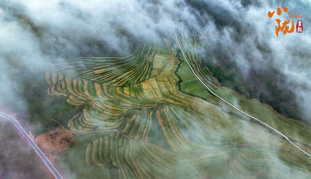 俯瞰大地,云霧飄飄,綠色梯田,縱橫交錯、順山而變,宛如一條條彩帶,在山間飛舞。