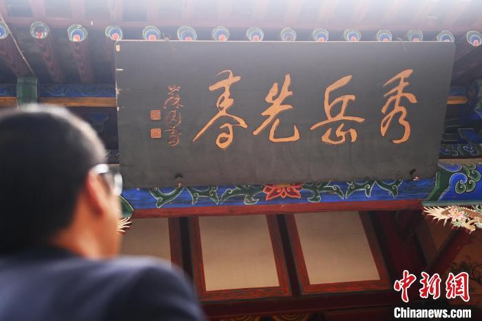 10月23日,甘肅省天水市秦安縣鳳山景區(qū),講解員介紹魯岱下人許行所題隸書(shū)“秀岳先春”的匾額。匾額文化是中華民族獨(dú)特的民俗文化,它把辭賦詩(shī)文、書(shū)法篆刻、建筑藝術(shù)融為一體。秦安作為歷史文化名城,其不少景區(qū)內(nèi)都存在歷史名人所題珍貴匾額,見(jiàn)證了歷史變遷。中新社記者 李亞龍 攝