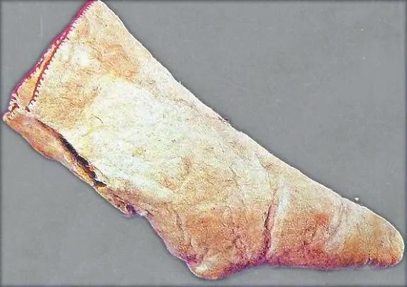 現(xiàn)代考古發(fā)現(xiàn)已證實(shí),早期人們穿的襪子確為皮襪。目前存世較早的一雙襪子是公元前九世紀(jì)的皮氈(zhān)襪,出土于新疆塔里木盆地南緣扎洪魯克古墓中。