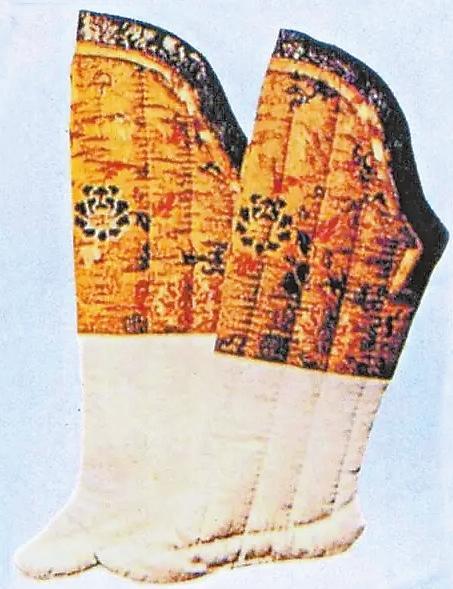 漢代的“夾襪”就是一種棉襪,這種襪子較單層襪厚實(shí),里外兩層,故名。湖南長沙馬王堆漢墓中曾出土過兩雙夾襪,由雙層素絹縫成,襪面用絹較細(xì),襪里用絹較粗。這是女襪,出土?xí)r放置在棺木邊箱的竹笥之內(nèi),從襪子當(dāng)隨葬品來分析,那時(shí)襪子已是生活中必備衣物。