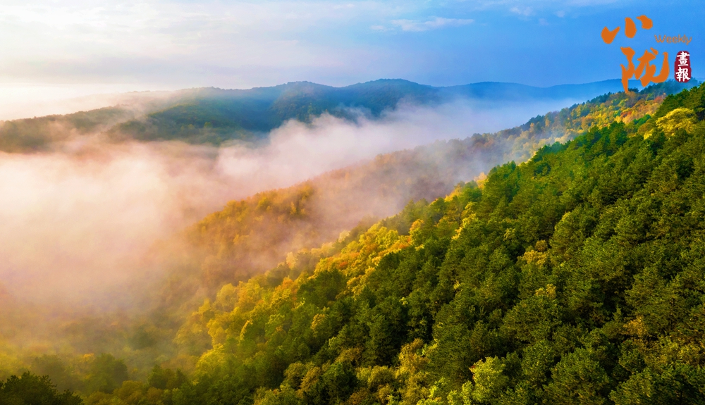 雨后日出,云遮霧蓋,為子午嶺披上一襲薄紗。金黃、深綠在陽(yáng)光下熠熠生輝,彰顯著生命的活力,形成了一片生機(jī)勃勃的天地。
