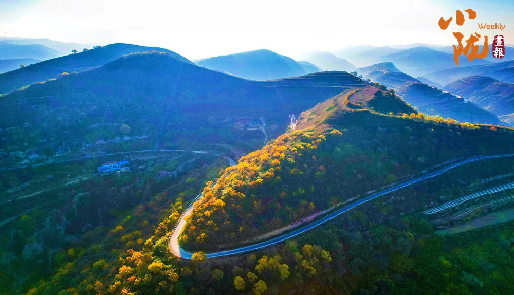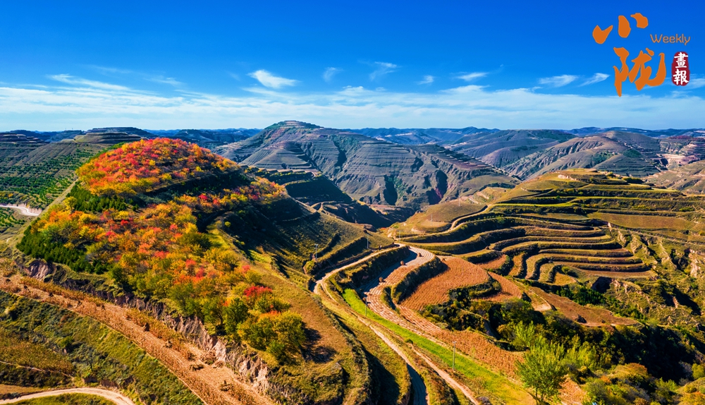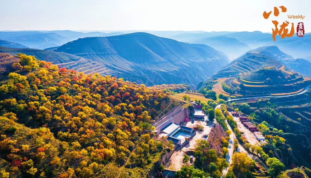 放眼望去,層林盡染,秋色與藍(lán)天白云相互映襯,把這里的溝壑梁峁裝點(diǎn)的五彩斑斕。