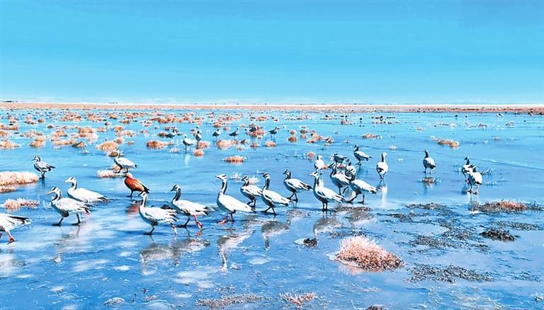 在這片濕地上,黃河的支流蜿蜒曲折,形成各式各樣的曲線。陽(yáng)光下,這些彎彎曲曲的大小沼澤,猶如一條條銀色的絲帶,閃閃發(fā)光。觸手可及的藍(lán)天白云無(wú)際無(wú)涯,像洗滌過(guò)似的,亮得耀眼,牛羊滿(mǎn)山坡,宛如散落在人間的珍珠。這種原始的自然美景和豐富的生態(tài)資源,讓阿萬(wàn)倉(cāng)濕地成為一個(gè)理想的旅游目的地。
