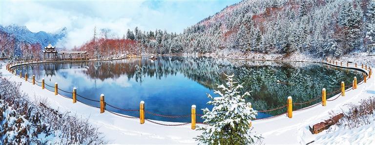 眺望遠(yuǎn)方,潔白的冰雪與擂鼓山遙相輝映,雪花盡飛處,仿佛細(xì)碎的春天早已鋪滿了原野。燕子湖的豐盈昭示著來(lái)年的風(fēng)調(diào)雨順,羊頭圖騰穿越千年的風(fēng)景,搖曳著鳳凰騰飛的美夢(mèng)。一個(gè)個(gè)湖畔,色彩暖暖的羌式小屋,靜靜地享受著冬日的安寧與愜意。