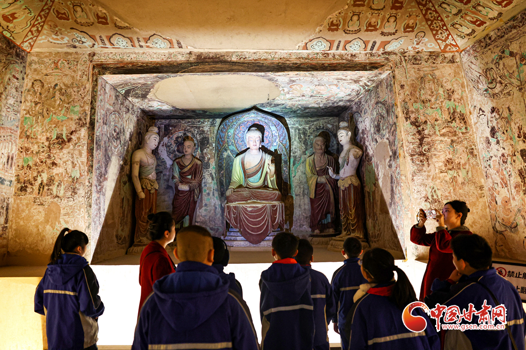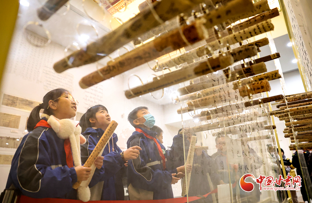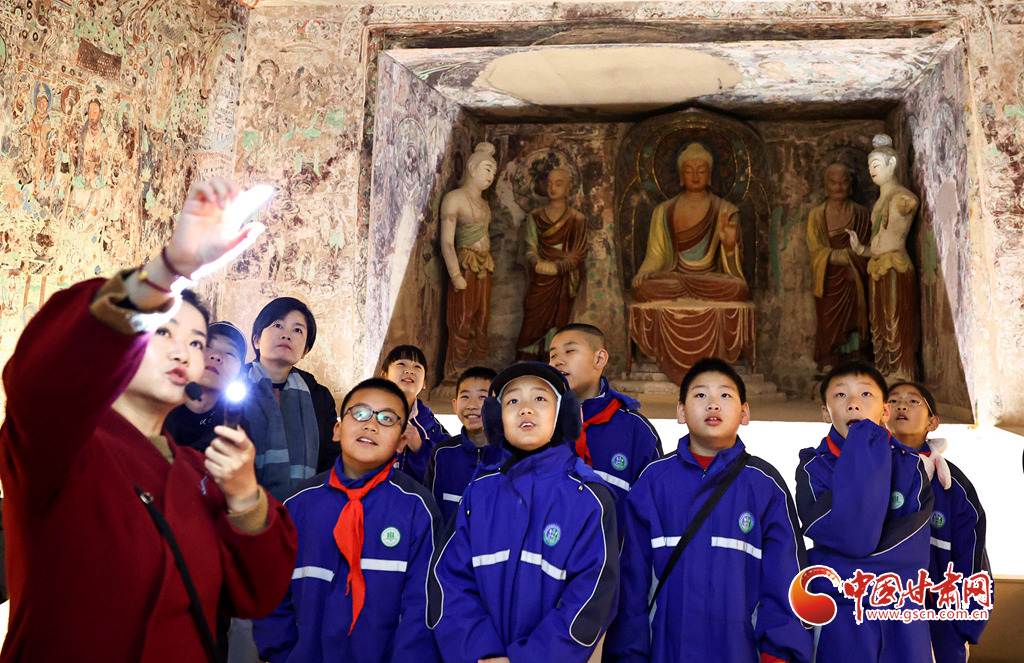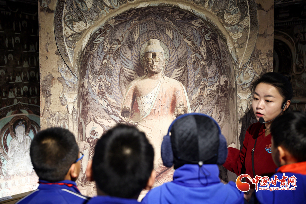 12月29日,蘭州市城關(guān)區(qū)安樂(lè)村小學(xué)學(xué)生在家人的陪同下來(lái)到敦煌研究院蘭州分院敦煌藝術(shù)館,欣賞“覺(jué)色敦煌 莫高精神”敦煌石窟藝術(shù)展,在周末時(shí)光近距離感受敦煌文化藝術(shù)的魅力。