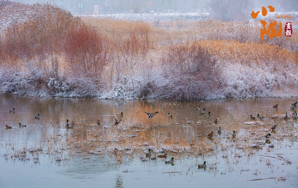 濕地公園白雪皚皚,景色如畫,湖面開始結(jié)冰,形成各種形狀的圖案,如同大自然的“畫作”。