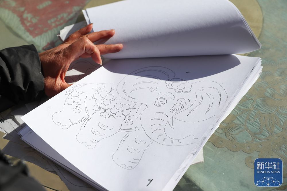 1月5日,在慶陽市合水縣西華池鎮(zhèn)唐旗村,張雪峰展示創(chuàng)作黃河古象主題剪紙時(shí)的草稿。