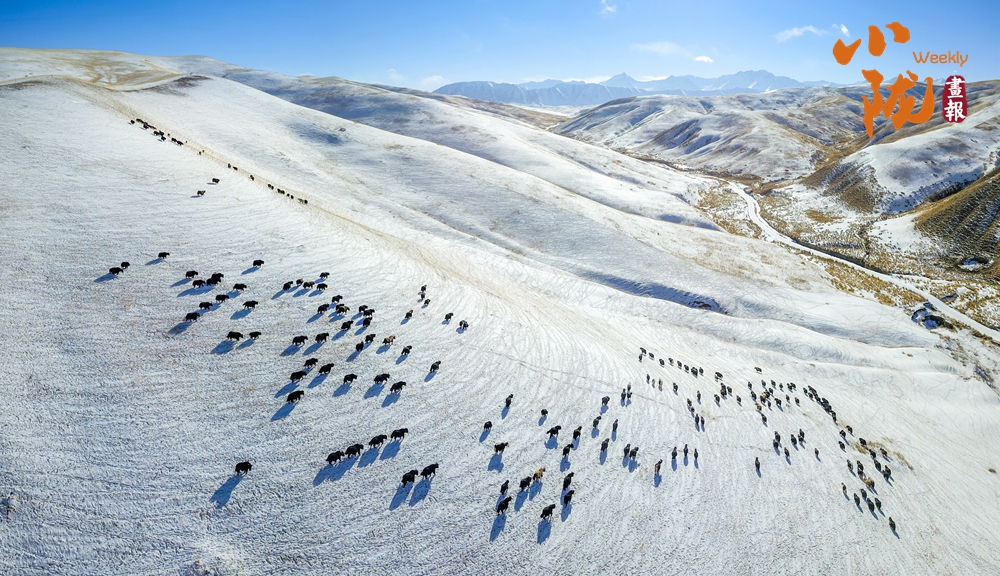 牛群在雪地中悠閑地覓食,和雪景相映成趣,給這片寧?kù)o的草原帶來(lái)了生機(jī)與活力。
