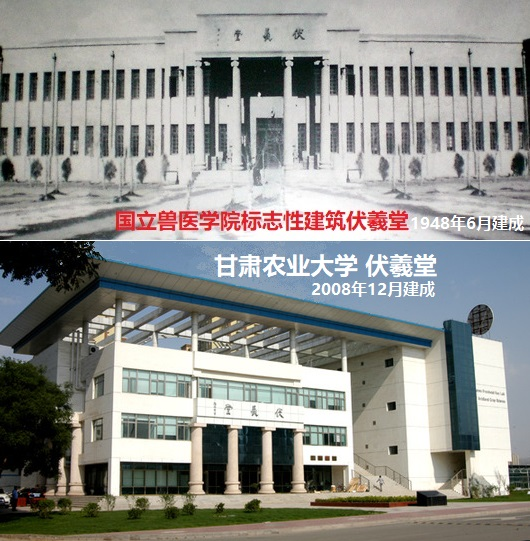 1946年10月國立獸醫(yī)學(xué)院成立后,于1948年6月建成了當(dāng)年蘭州最雄偉壯觀的建筑——伏羲堂。有深厚國學(xué)功底的校長(zhǎng)盛彤笙,為紀(jì)念人文始祖伏羲氏在認(rèn)識(shí)自然、適應(yīng)自然、改造自然和發(fā)展生產(chǎn)生活的過程中,所進(jìn)行的一系列造福人類的發(fā)明創(chuàng)造,將這幢教學(xué)大樓命名為“伏羲堂”,并親自撰寫了一篇銘文《伏羲堂記》,“用追前烈,以志建堂之艱難”。