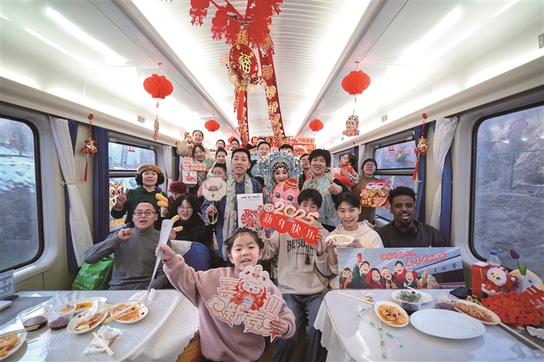 在歌聲、鼓聲、歡笑聲中,出鍋的餃子讓跨年列車的車廂年味更濃,把“春運(yùn)回家”這一樸素而又濃烈的幸福感,通過舌尖味蕾傳遞,把“團(tuán)圓便是年”“回家的路就是最美的風(fēng)景”,通過餃子這一代表著中國(guó)人情愫強(qiáng)烈的文化符號(hào),將天南海北奔赴山海的人們團(tuán)聚在列車、歡度在旅途。