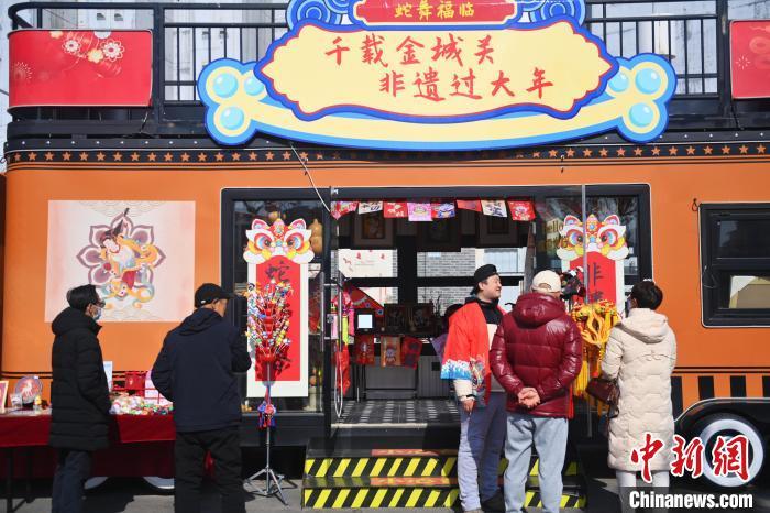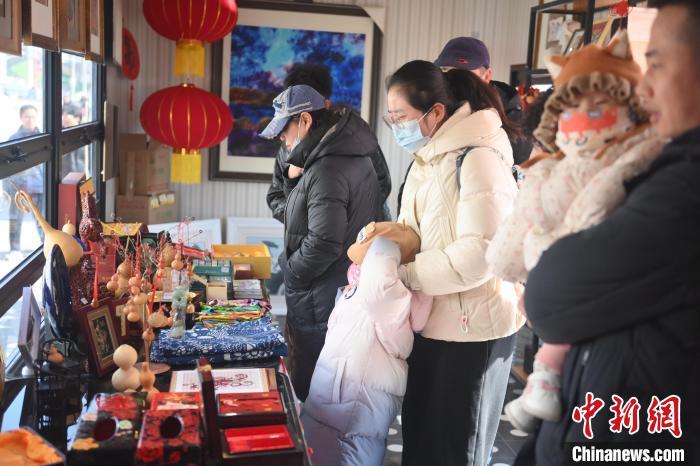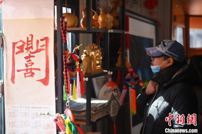 2月8日,甘肅省蘭州市城關區(qū)“非遺年貨購物月”活動現(xiàn)場,游人選購非遺文創(chuàng)產品。中新社記者 李亞龍 攝