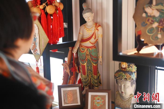 2月8日,甘肅省蘭州市城關區(qū)“非遺年貨購物月”活動現(xiàn)場,游人挑選敦煌系列文創(chuàng)產品。中新社記者 李亞龍 攝
