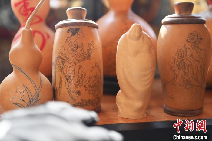 2月8日,甘肅省蘭州市城關區(qū)“非遺年貨購物月”活動現(xiàn)場展出的刻葫蘆文創(chuàng)產品。 中新社記者 李亞龍 攝