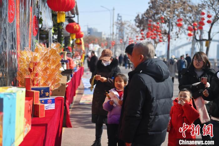 2月8日,甘肅省蘭州市城關區(qū)“非遺年貨購物月”活動現(xiàn)場,游人購買蘭州三炮臺、糖畫等傳統(tǒng)美食。 中新社記者 李亞龍 攝