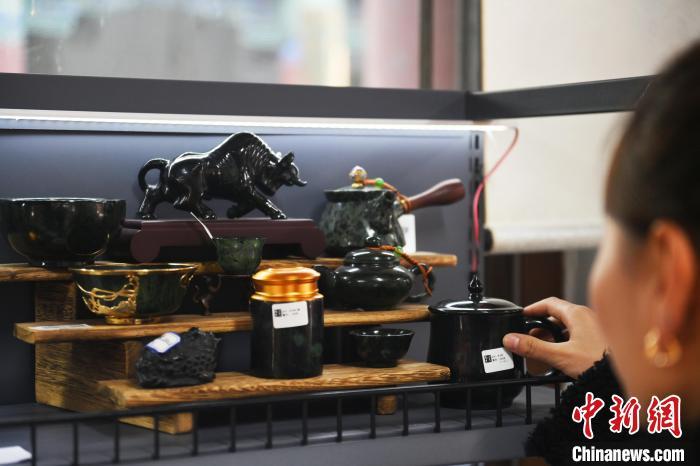 2月8日,甘肅省蘭州市城關區(qū)“非遺年貨購物月”活動現(xiàn)場,游人挑選武山鴛鴦玉夜光杯茶具。中新社記者 李亞龍 攝