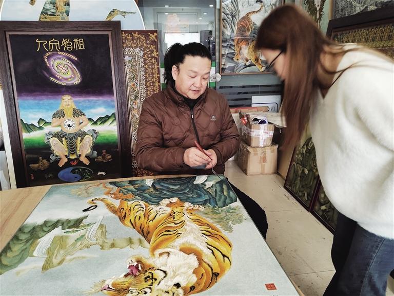 不遠(yuǎn)處的刻葫蘆攤位前,非遺代表性傳承人阮熙越運(yùn)刀如筆,在打磨光潤(rùn)的葫蘆表面刻出圖案。“刻針深淺決定墨色濃淡,蘭州葫蘆皮質(zhì)厚實(shí),才能承載這樣的藝術(shù)語(yǔ)言。”正在體驗(yàn)刻繪的大學(xué)生張萌說(shuō)。從傳統(tǒng)書畫到現(xiàn)代動(dòng)漫IP,從擺件到車掛,近幾年刻葫蘆在創(chuàng)新中走向大眾。據(jù)文旅部門統(tǒng)計(jì),非遺購(gòu)物月期間刻葫蘆銷售火熱,成為最受游客青睞的“蘭州名片”。