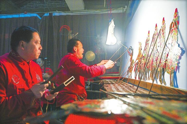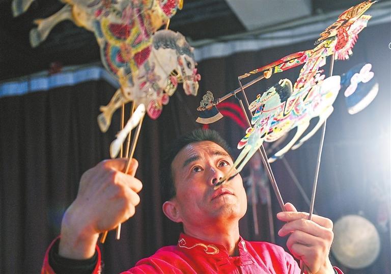 近日,記者走進環(huán)縣環(huán)州故城道情皮影館,燈光暗去,音樂響起,泛黃的幕布后,市級非遺代表性傳承人許明堂的“老道情”吼起來,在他的十指轉動間,幕布上的皮影人物“活”起來:坐臥、行走、提袍甩袖,伴隨著各種樂器,一場精彩的《羅通掃北》皮影戲上演。