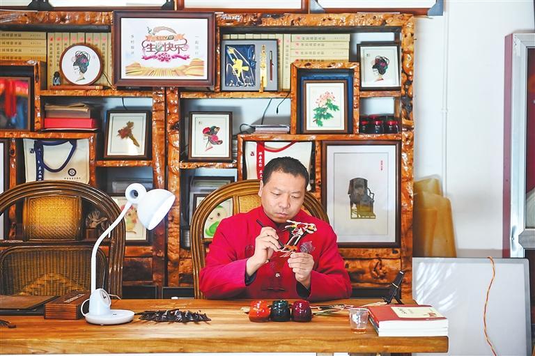 手工藝人張治文借鑒民間剪紙的傳統(tǒng)手法,以牛皮為料,按照制皮、過樣、雕刻、著色、出水、裝訂等工序精心制作一張張皮影。道情皮影既是演出的道具又是獨立的藝術品,魅力在于其獨特的表演形式和精湛的制作工藝。