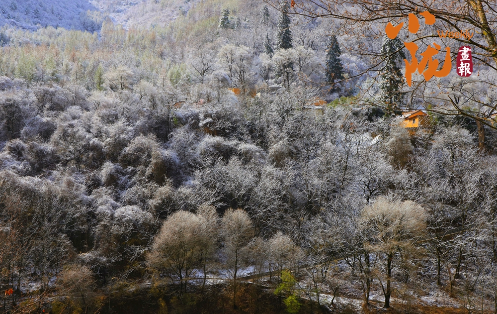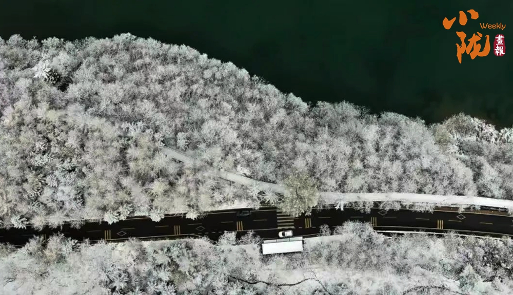 遠(yuǎn)峰近林,銀裝素裹,似是素手描繪的水墨畫卷。