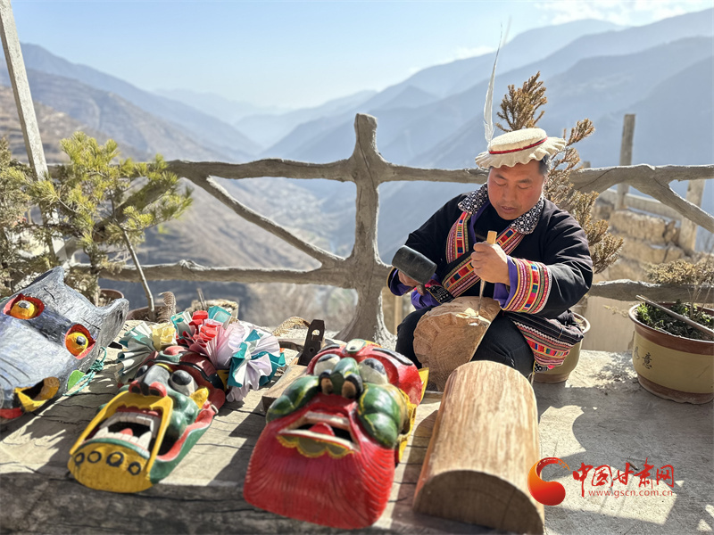 甘肅隴南市文縣鐵樓藏族鄉(xiāng)強(qiáng)曲村,白馬群眾薛剛一家四代人都精于木工。薛剛坐在自家院子里,伏案制作池哥晝所用面具。池哥晝是白馬人保留最完整、最具特色民族舞蹈,面具是重要道具之一。