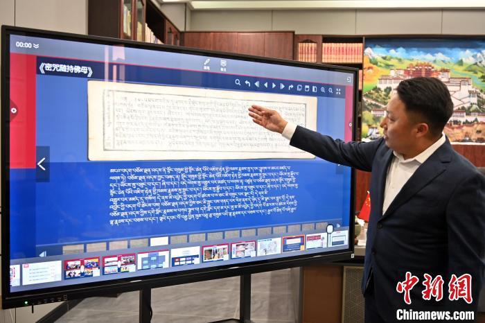 2月27日,在甘肅甘南藏族自治州碌曲縣益西達吉科技有限公司內(nèi),工作人員正在進行藏文古籍數(shù)字化相關工作。該公司主要從事民族古籍數(shù)字化建設和古籍文獻數(shù)據(jù)庫建設,自2019年以來,承擔西藏、四川、甘肅等省區(qū)的藏文古籍數(shù)字化項目。圖為工作人員介紹藏文古籍數(shù)字化相關工作。中新社記者 九美旦增 攝