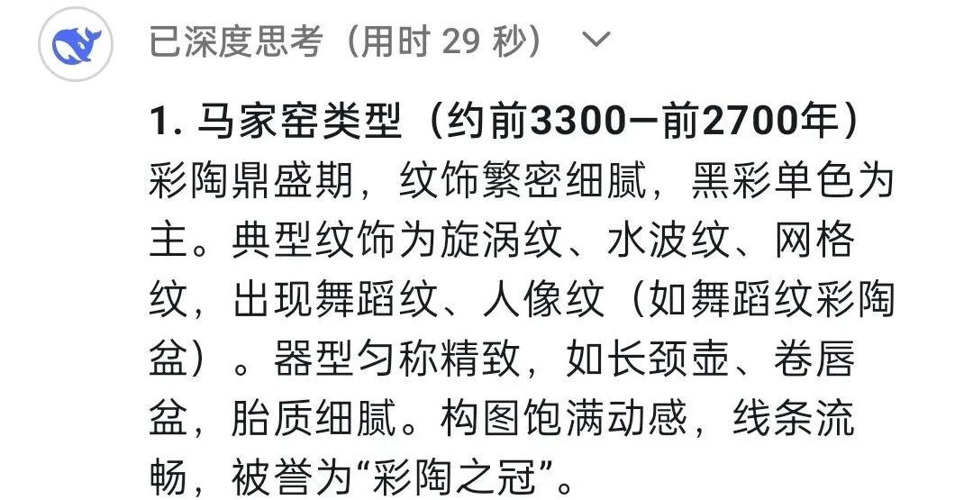 DeepSeek:馬家窯文化作為人類文明長河中一顆璀璨的明珠,因最早發(fā)現(xiàn)于甘肅省臨洮縣馬家窯村而得名,它被認為是仰韶文化向西發(fā)展的延續(xù),它展現(xiàn)了黃河上游先民的創(chuàng)造力,更是史前人類與自然對話、與社會共生的見證。