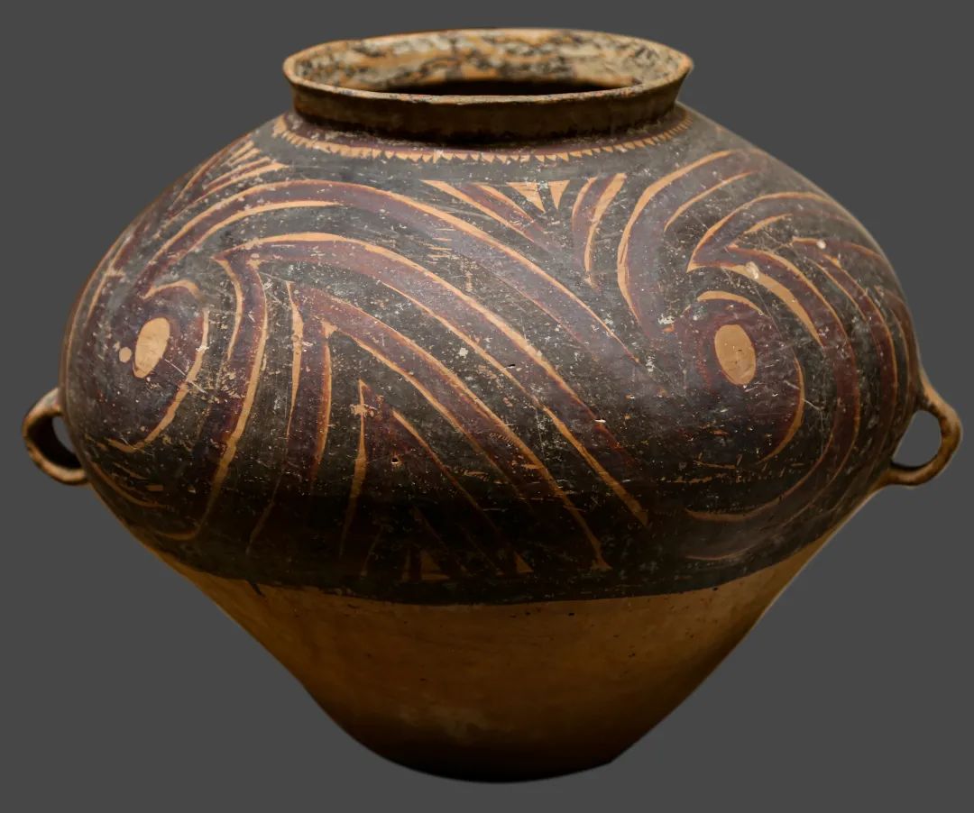 旋渦紋由黑彩繪制的螺旋線條構(gòu)成,線條從中心向外延伸,形成連續(xù)旋轉(zhuǎn)的幾何圖案。多見于陶罐腹部或盆沿,線條粗細均勻,疏密排列規(guī)律,常與波浪紋組合,呈現(xiàn)動態(tài)視覺效果。