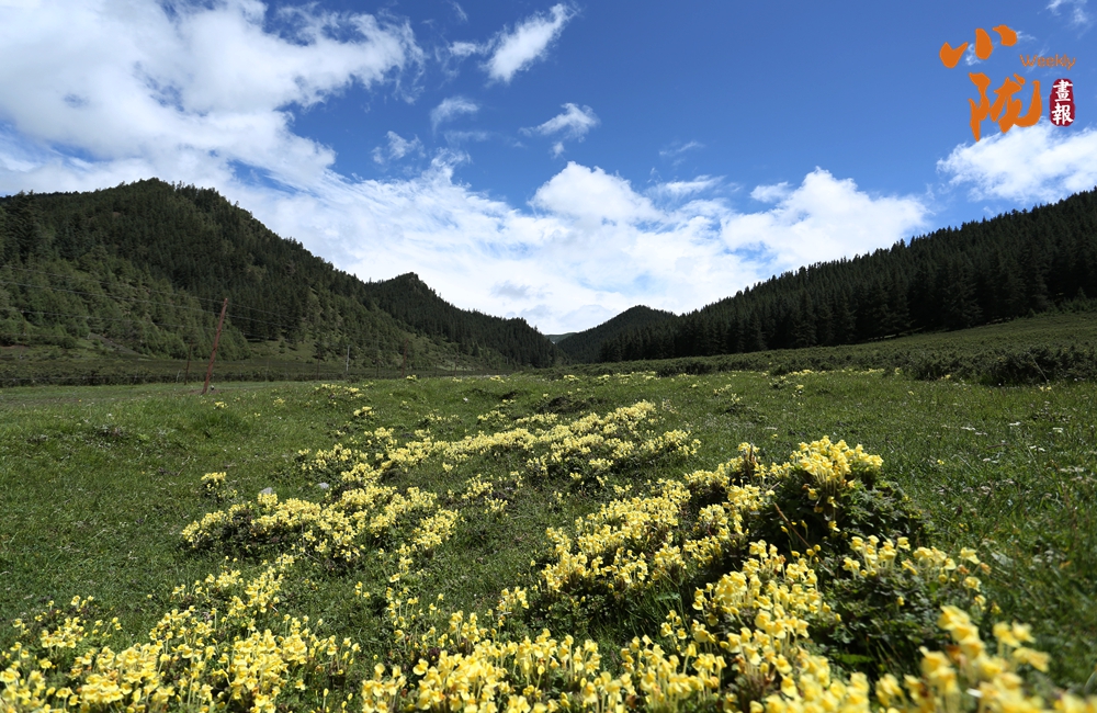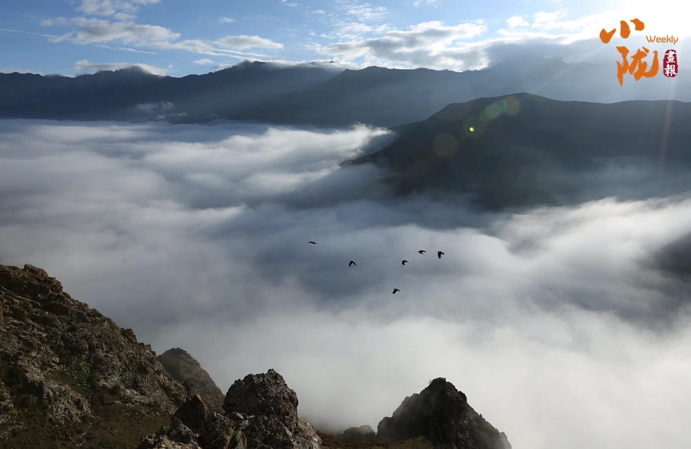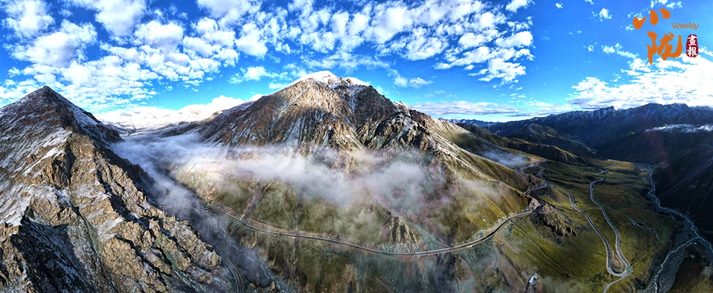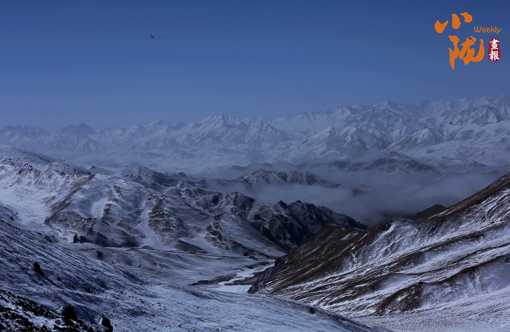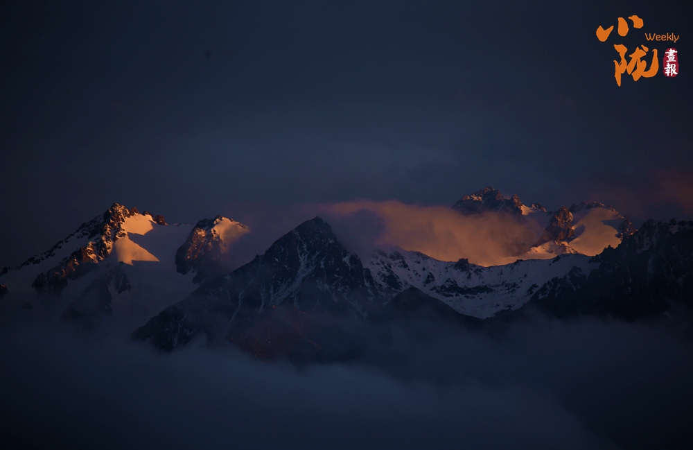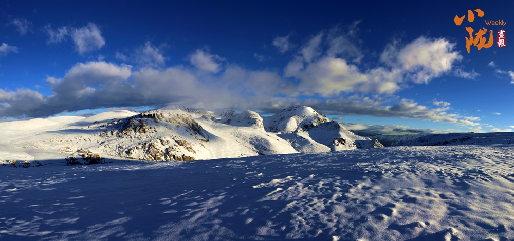 側(cè)目而視,近日一場降雪和夏日閑云相伴相依,近處的雪和遠(yuǎn)處的云相映成趣,共同把天空擦拭得深藍(lán)如鏡。這種“積雪長留峰素裹,浮云飄忽去無邊”的夢幻景色,會將你平日里積蓄在心頭的那些世俗凡塵濯洗得干干凈凈,有一種遠(yuǎn)離人世的幻覺。