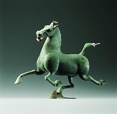 走進(jìn)甘肅省博物館,這匹東漢神駒,仿佛正在飛馳,攫住了所有人的目光——它全身呈流線型,肌肉健碩有力。它的口、眼、鼻均張開(kāi),三足騰空而起,一足踏于飛鳥(niǎo)之上,在飛鳥(niǎo)回首驚顧的一剎那,它已超越流星般飛行的鳥(niǎo)向前而去。馬的奔騰嘶鳴和風(fēng)的呼嘯猶在耳畔,這個(gè)風(fēng)馳電掣的瞬間也被定格成永恒。