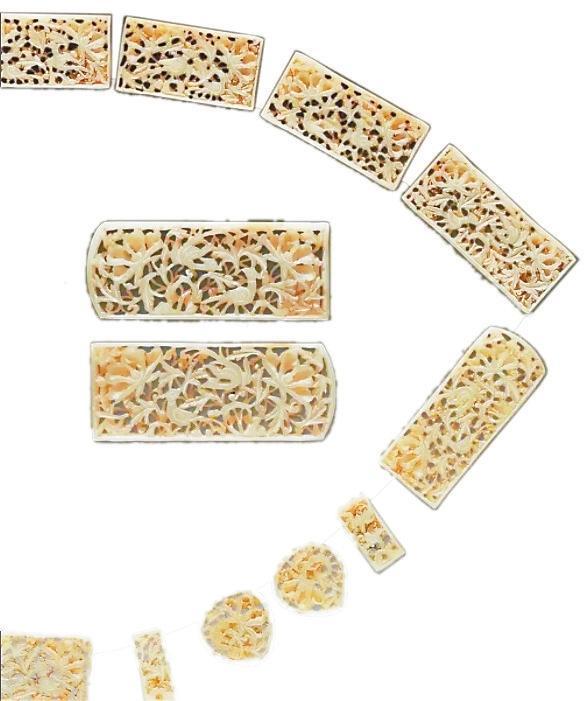 排方長5.1厘—7.6厘米、寬3.3厘米、厚0.7厘米,1955年蘭州市上西園明墓出土。青灰色和田玉鏤雕而成,包括三臺(tái)1、弼輔4、圓桃4、鉈尾2、排方7,均透雕牡丹花枝,邊緣有界欄。其中四塊較大的長條排方,雕飾最為精美,于繁花密葉間配置一對雉雞,構(gòu)圖繁縟,富于變化,顯示出工匠高超的技術(shù)造詣。