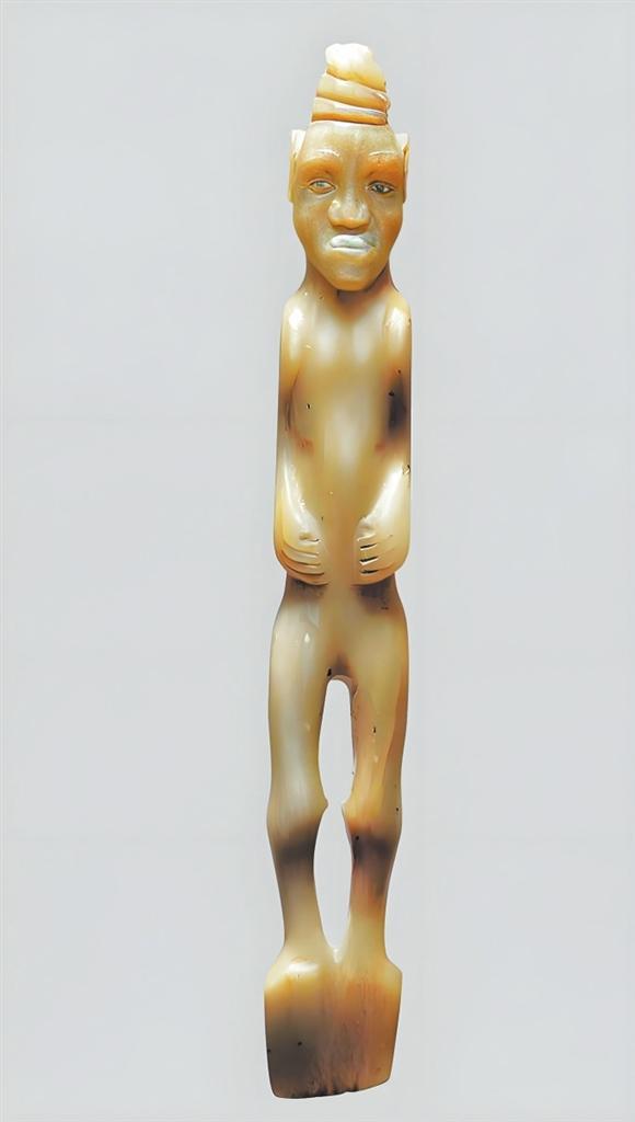 玉人形鏟高17.6厘米,1967年靈臺(tái)縣白草坡M1出土。圓雕工藝,人物裸體站像。發(fā)辮虎首蛇身盤成堆髻。長臉,闊鼻,深眼窩,大耳,厚唇前突,兩手捧腹,兩腿間呈“8”形鏤空,雙足并攏作鏟形。